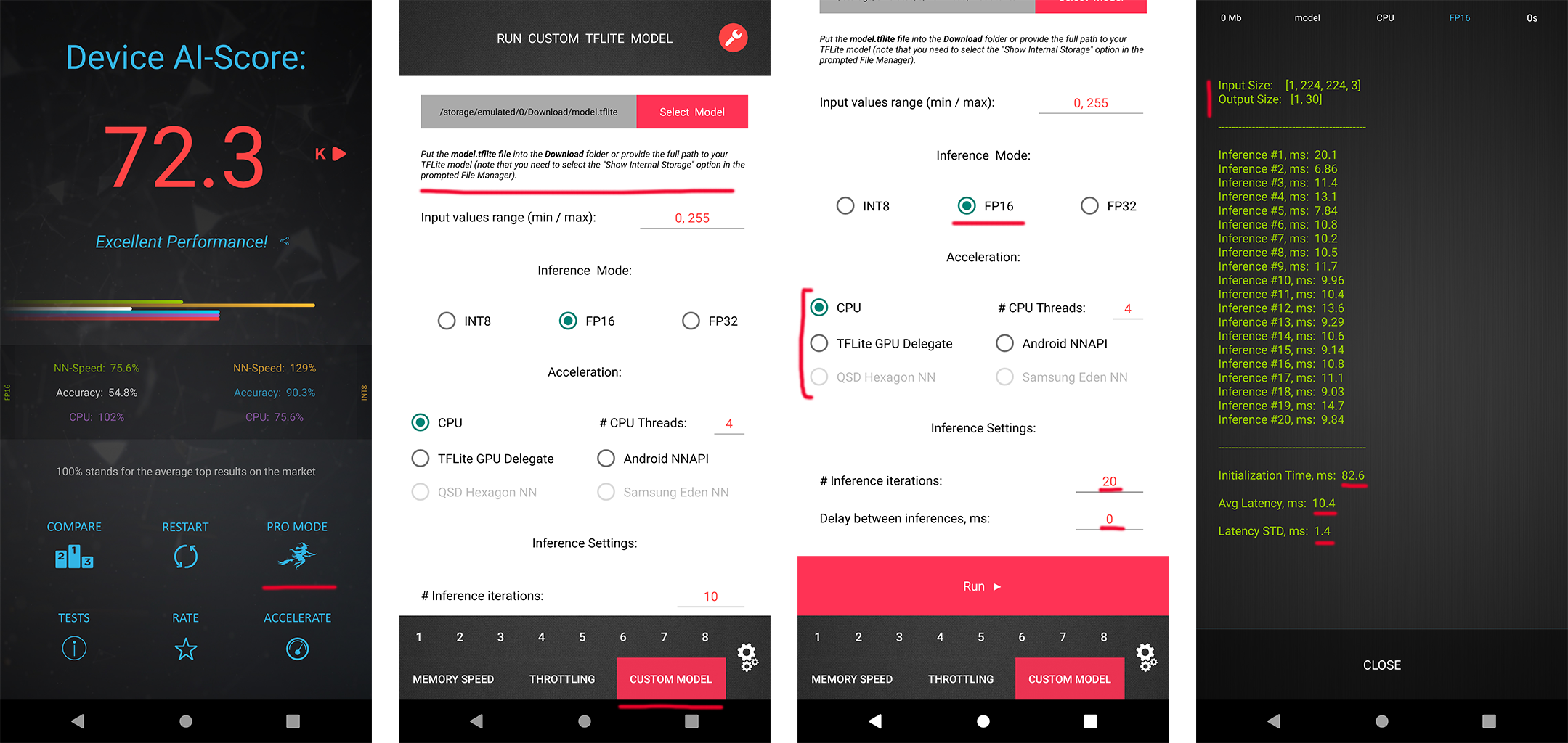 In each MAI 2026 challenge track, the participants have a possibility to check the runtime of their solutions remotely on the target platforms. For this, the converted TensorFlow Lite models should be uploaded to a special web-server, and their runtime on the actual target devices will be returned instantaneously or withing 24 hours, depending on the track. The detailed model conversion instructions and links can be found in the corresponding challenges. Besides that, we strongly encourage the participants to check the speed and RAM consumption of the obtained models locally on your own Android devices. This will allow you to perform model profiling and debugging faster and much more efficiently. To do this, one can use AI Benchmark application allowing you to load a custom TFLite model and run it with various acceleration options, including CPU, GPU, DSP and NPU: 1. Download AI Benchmark from the Google Play / website and run its standard tests. 2. After the end of the tests, enter the PRO Mode and select the Custom Model tab there. 3. Rename the exported TFLite model to model.tflite and put it into the Download folder of your device. 4. Select your mode type, the desired acceleration / inference options and run the model. You can find the screenshots demonstrating these 4 steps below: